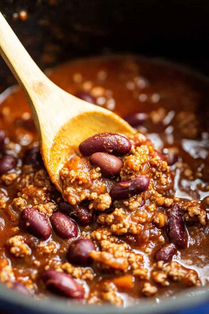 After hours of slow simmering, the flavors blend into something rich and hearty. The meat turns tender, the beans soften perfectly, and the sauce thickens into chili perfection.