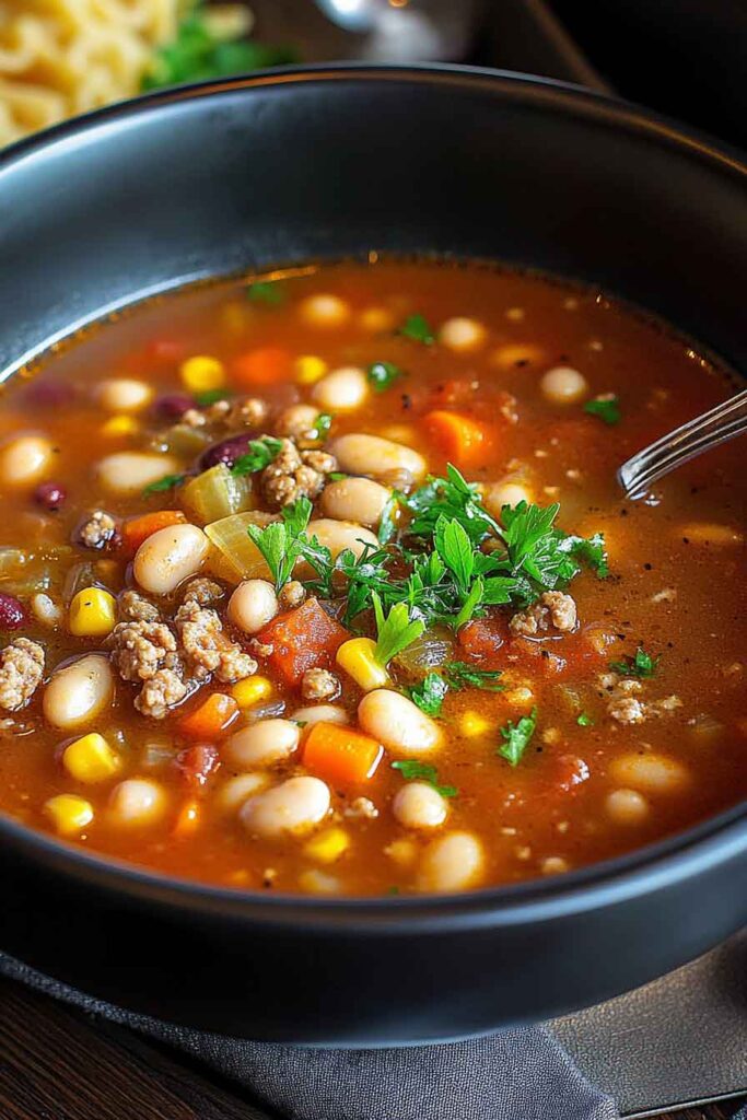 This hearty soup is like a warm hug in a bowl. Packed with beans, pasta, vegetables, and savory seasonings, it’s filling and comforting.